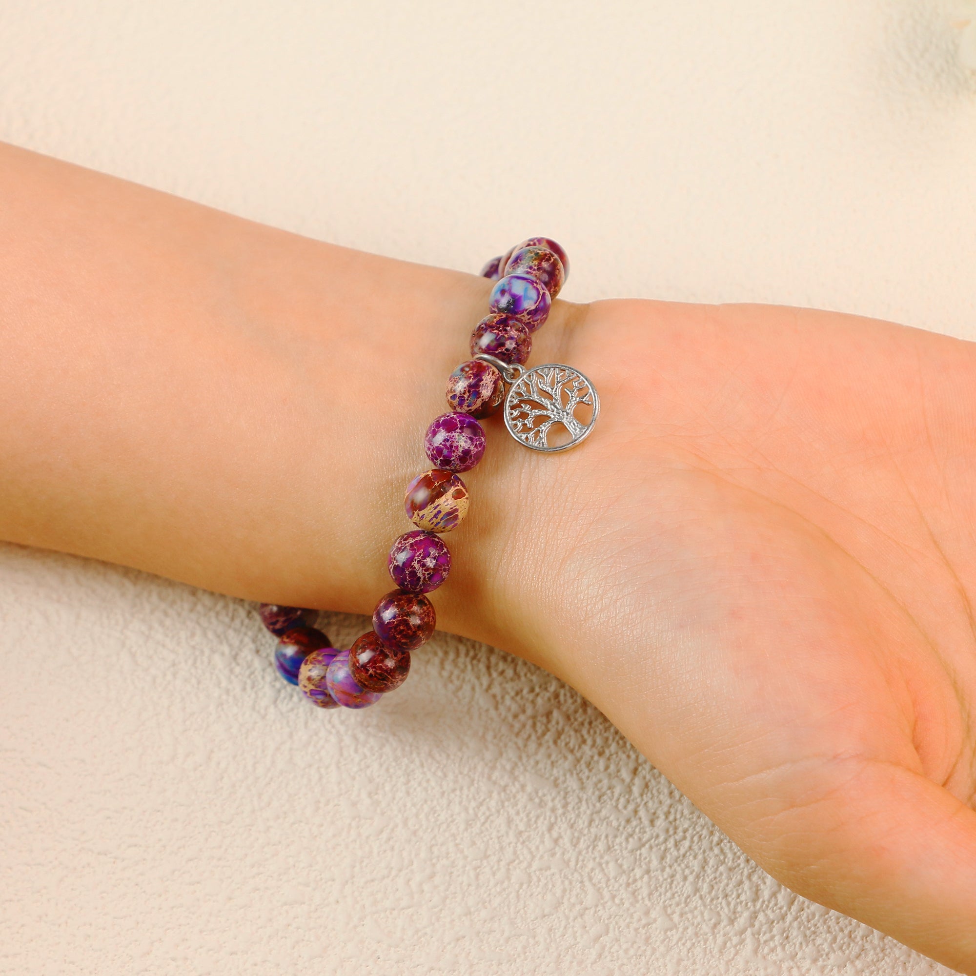 Honor the extraordinary woman who chose to love: This purple zebra jasper bracelet, crowned with a Tree of Life charm, celebrates your ‘bonus mom’—the one whose heart built a family beyond biology. Each natural stone stripe mirrors your unique bond, while the eternal circle whispers: ‘Our connection defies DNA’.  The perfect gift for Mother, expressing love and gratitude.