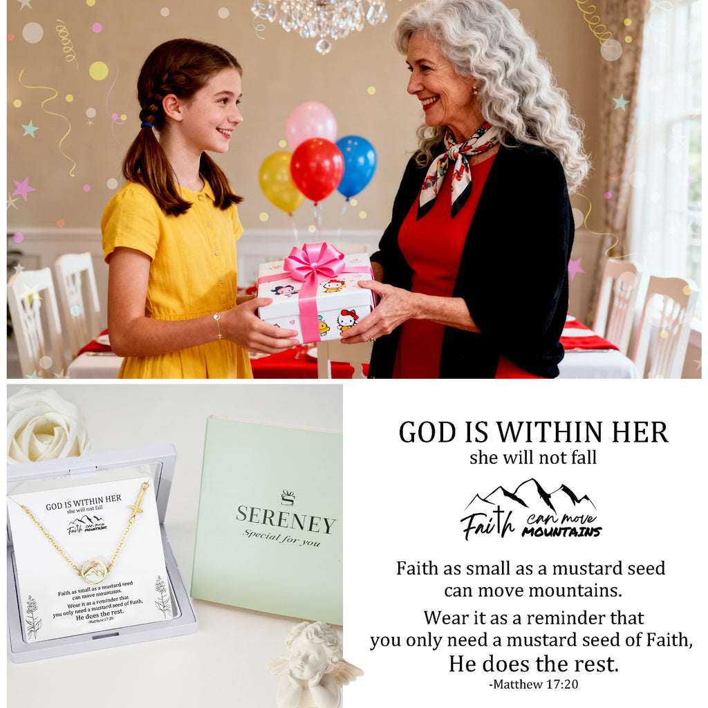 This meaningful mustard seed cross bracelet serves as a beautiful daily reminder of God's strength within her. It symbolizes that even the smallest faith can overcome life's greatest challenges when we trust in Him. The perfect spiritual gift for any occasion.